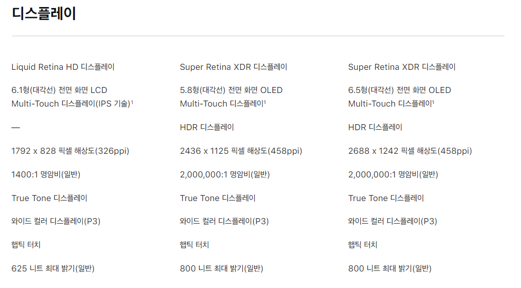 반면 아이폰11은 아이폰XR 과 동일한 6.1인치 LCD를 사용해서 동일한 해상도에 베젤이 두껍고 유튜브 HDR 컨텐츠를 지원하지 않아 좀 아쉬움이 남습니다.